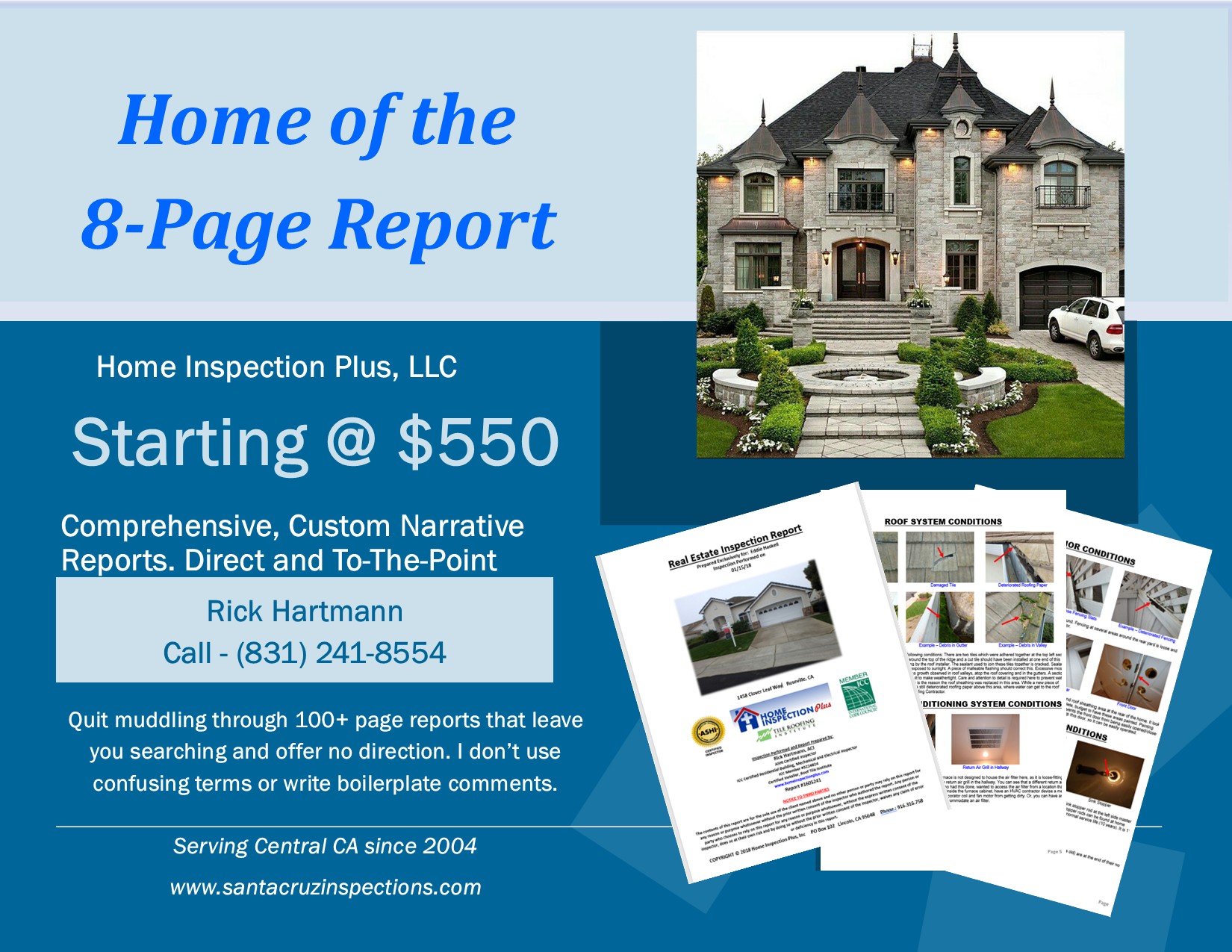 Before choosing an inspector, look at their sample reports. If their sample report does not make sense, yours won't make sense either. If it's over 30 pages, keep looking. Use my sample report and qualifications when comparing others. It is foolish to shop for a home inspection by price alone. In this business, you get what you pay for.